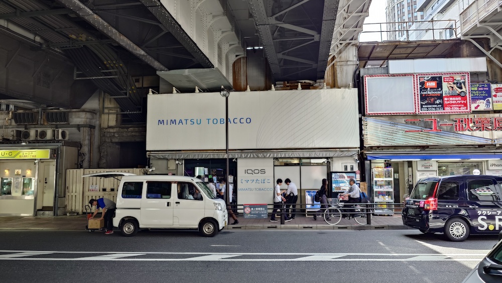 万世橋所前の通り、高架下にあるたばこ屋に併設している喫煙所。