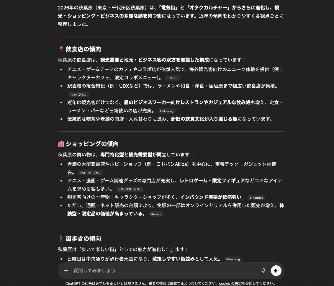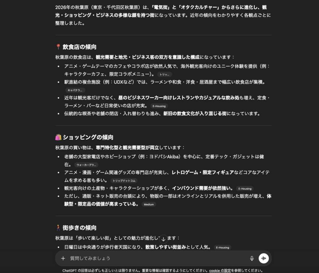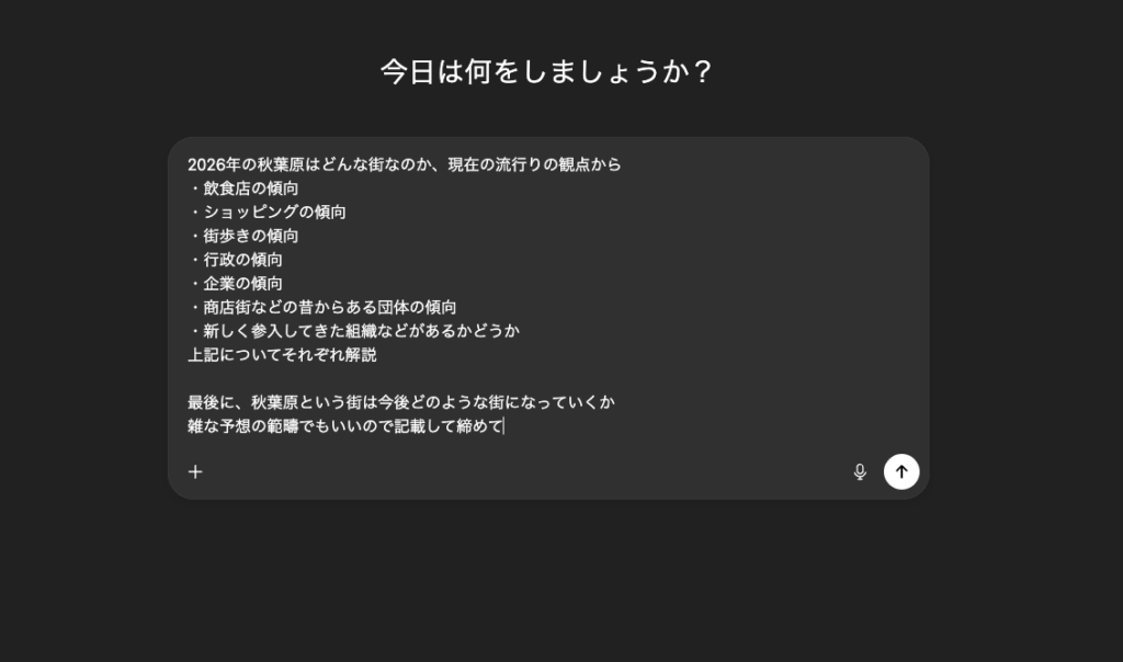 今回は条件設定を行い、チャッピーが秋葉原という街をどのように解説・紹介するのかを調べてみました。