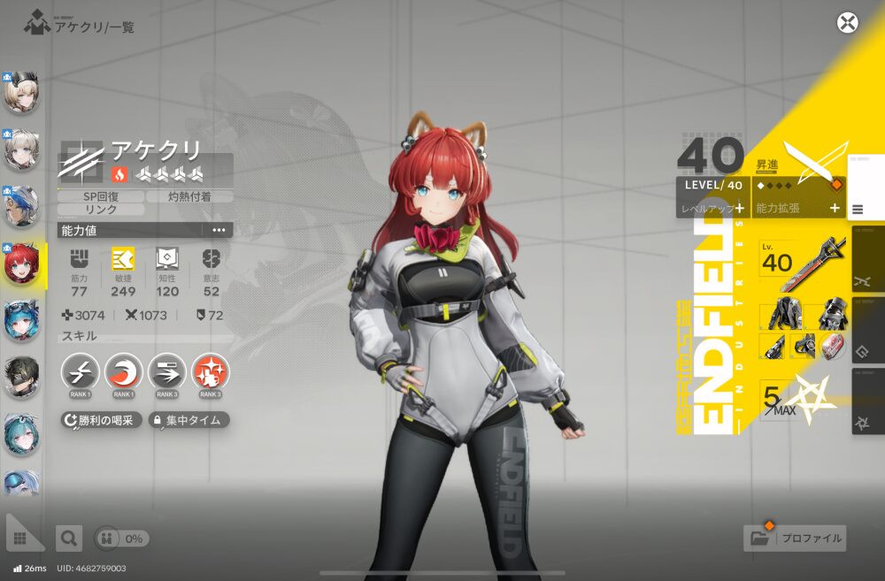 ▼レア度4ながらスキルが強すぎる代表のアケクリちゃん。SP回復強すぎ